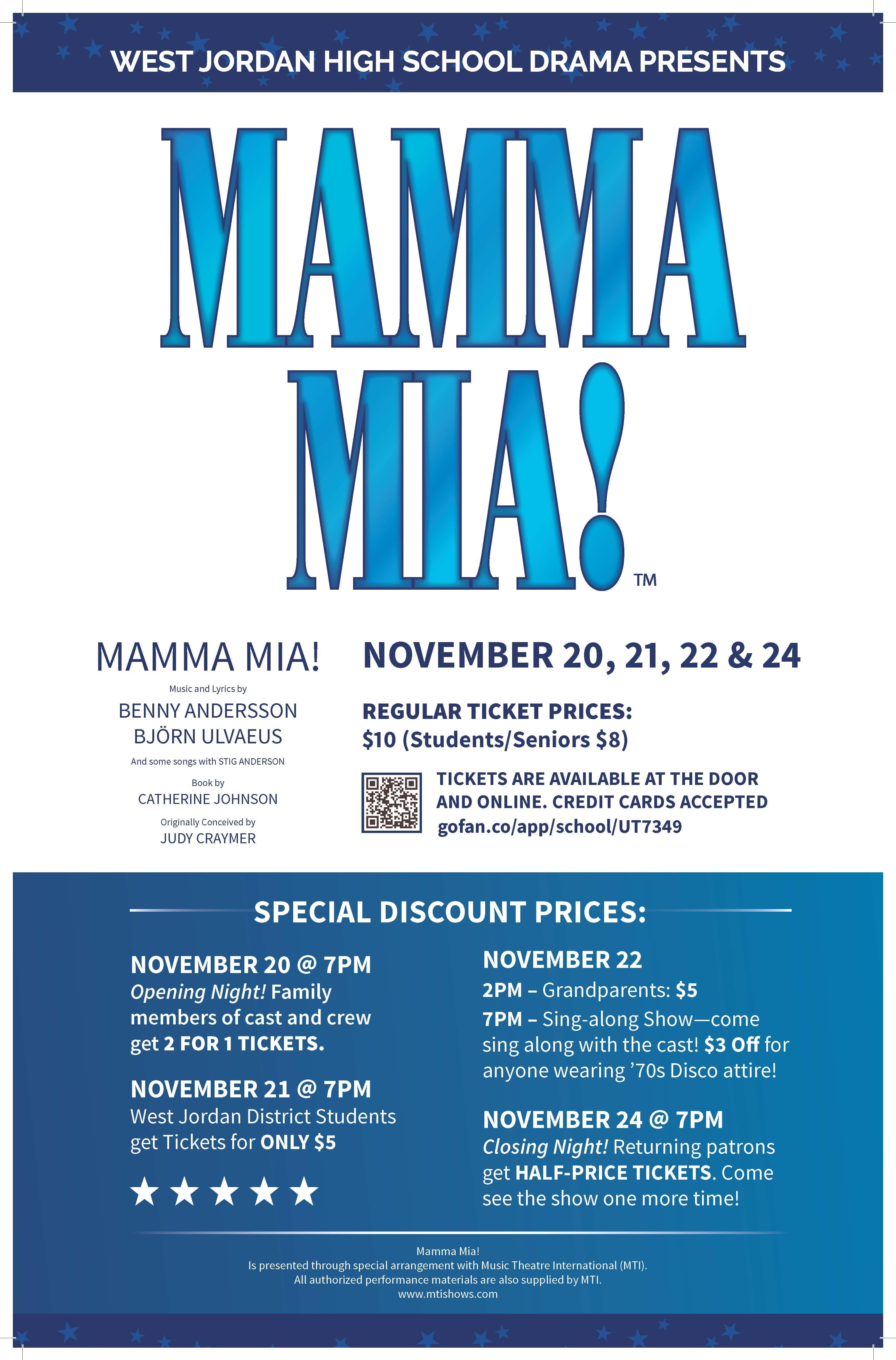 Mamma Mia! Click on the image for pricing and discounts! Show dates and times: Thursday, November 20th @ 7:00pm Friday, November 21st @ 7pm Saturday, November 22nd @ 2pm Saturday, November 22nd @ 7pm Monday, November 24th @ 7pm Click here to purchase your tickets