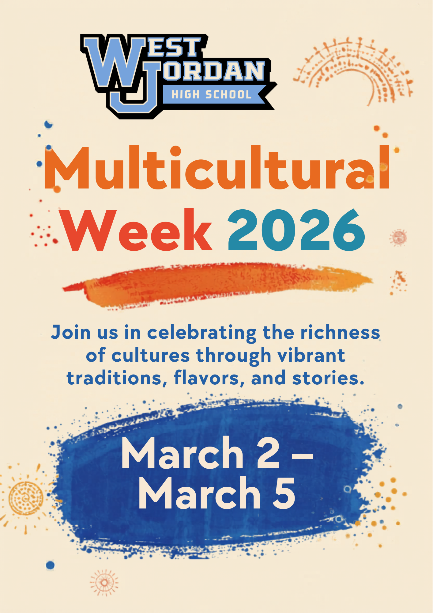 Multicultural Week 2026 This week, West Jordan High School will celebrate our annual Multicultural Week! This is a special time for us to recognize the incredible diversity that makes our school community so vibrant and to celebrate the unity we share.